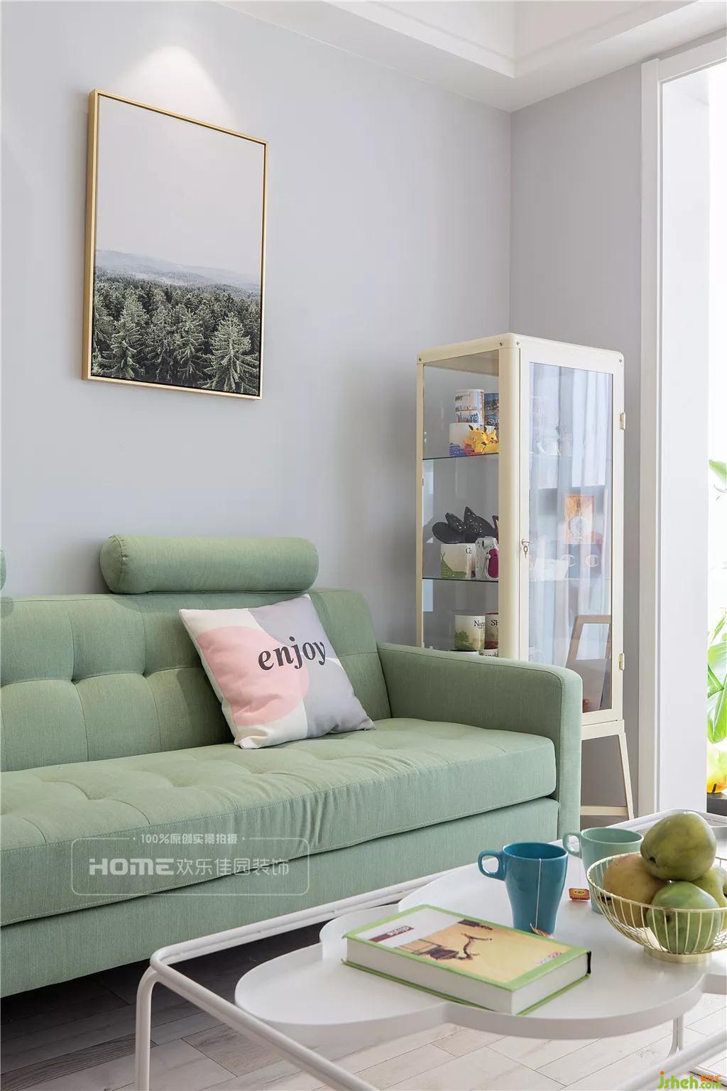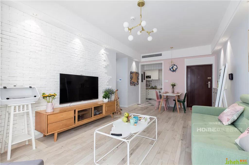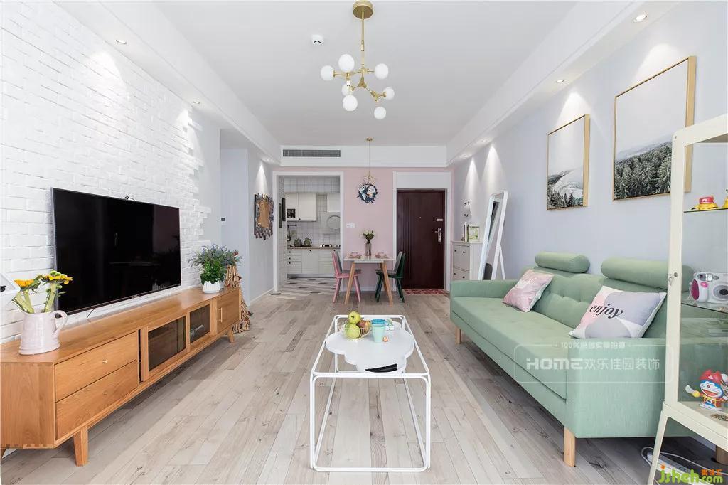 清淺的綠,夢(mèng)幻的粉,略顯跳躍與奪目的原木,在這方極致純凈的空間里,顯得更加平衡也更有格調(diào)。因考慮到環(huán)保,設(shè)計(jì)師在選材上大多數(shù)兼具環(huán)保和美觀(guān)特性的元素,文化磚、棉麻沙發(fā)、實(shí)木電視柜......