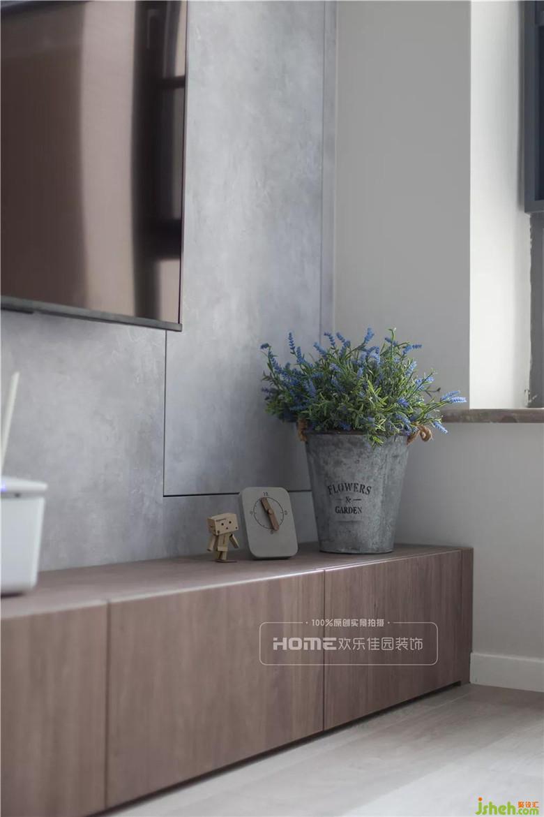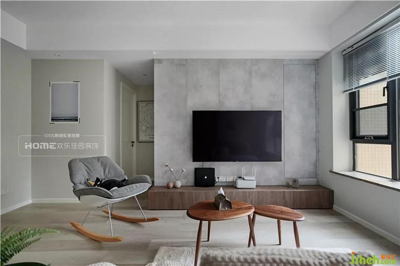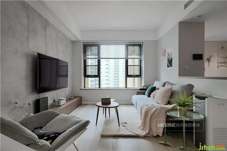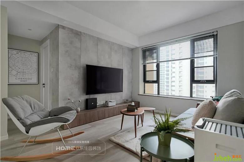 整個客廳空間以黑白灰定義現代,以原木系的家具界說北歐風,客廳電視背景墻水泥灰是泡泡的心頭愛,占墻面?的窗戶,自然采光提升室內明亮感,襯得室內粉與灰,黑與白的精彩碰撞。