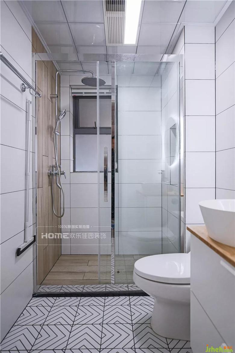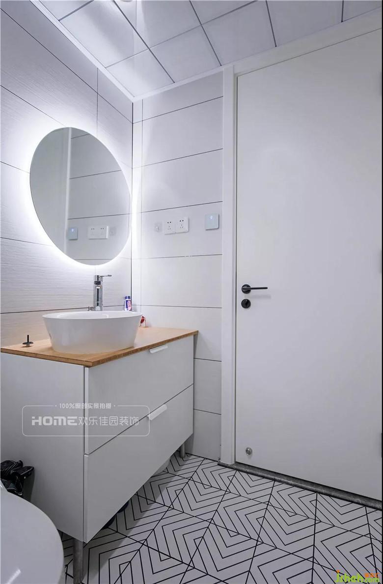 次衛(wèi)的亮點(diǎn)設(shè)計(jì)是魚骨紋地磚和自帶特效的鏡子。帶有北歐風(fēng)元素的地磚花式鋪貼,主推魚骨紋,地磚并行排列,線條的力度與次衛(wèi)相配合;圓形的鏡面,背面一圈的燈帶,增加了空間的精致感受。