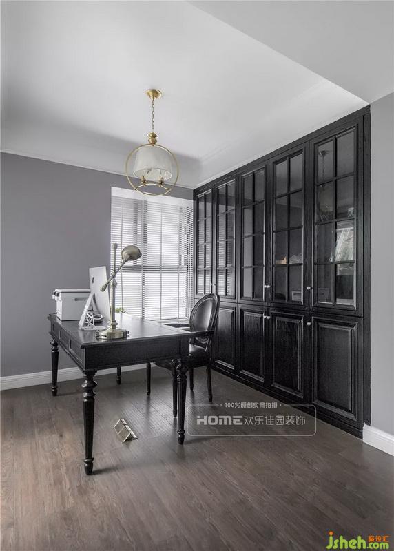 幽靜的書房空間,出于業(yè)主對(duì)深色家具的偏愛,依舊選擇黑色的書桌與書柜,濃重的色彩,簡約的布置,嵌入式書柜設(shè)計(jì)凸顯出主人的高雅與大氣。