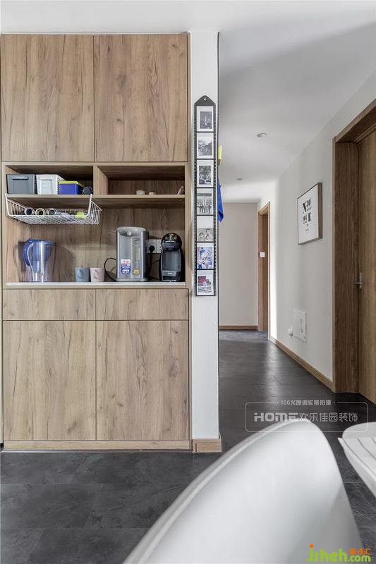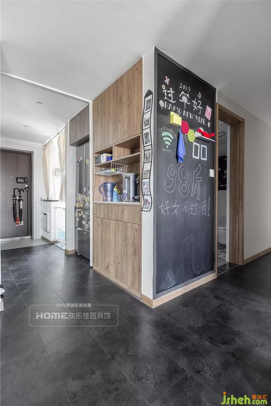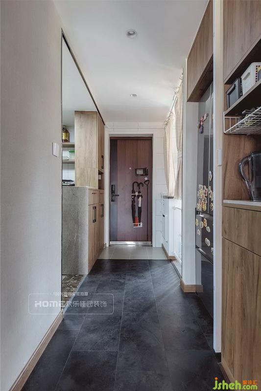 原戶型是沒(méi)有玄關(guān)的,后期將入戶花園改造成玄關(guān),同時(shí)增加生活陽(yáng)臺(tái)、衛(wèi)生間兩個(gè)區(qū)域的使用面積,設(shè)計(jì)師巧妙的在入戶設(shè)計(jì)了門(mén)簾隔斷廚房和客餐廳空間,有效的拓展室內(nèi)空間。