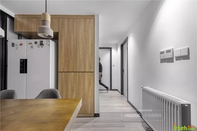 實木的餐桌搭配黑色鐵藝的桌腳,再輔以灰色布藝餐椅組合,在自然的氛圍下,木質與灰色奏出和諧的樂章,定制的餐邊柜,預留冰箱擺放的尺寸,使空間產(chǎn)生撞色感,家具的自然過渡,簡約的設計顯得更加有家的味道。