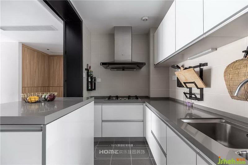 L型的櫥柜布局,米色的墻磚與白色的櫥柜相組合,搭配水泥灰的操作臺面與地磚,緩解廚房空間的壓抑感,整潔又耐臟。