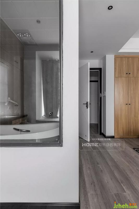 主臥由原戶型的兩個次臥打通合并形成,規(guī)劃了衣帽間,并將衛(wèi)生間和衣帽間之間的墻體改用玻璃代替,以此來保證衛(wèi)生間的采光。
