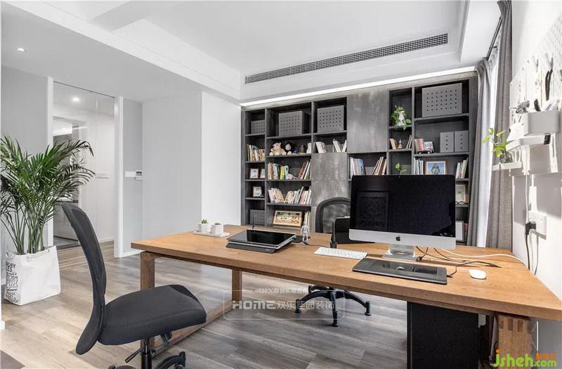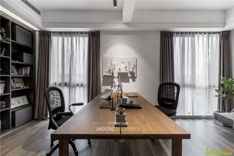 原書(shū)房的進(jìn)門(mén)位置影響著書(shū)房的布局,室內(nèi)設(shè)計(jì)師后期的改造上,將原書(shū)房的門(mén)封閉,在過(guò)道上重新規(guī)劃門(mén)洞,并在封閉的位置規(guī)劃一排到頂?shù)臅?shū)柜,設(shè)計(jì)師在窗戶(hù)中間置放書(shū)桌,保證倆人可以同時(shí)使用。