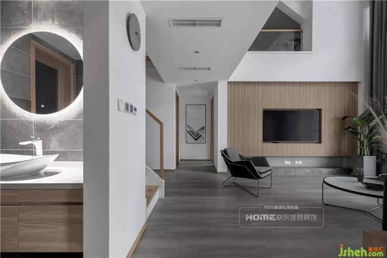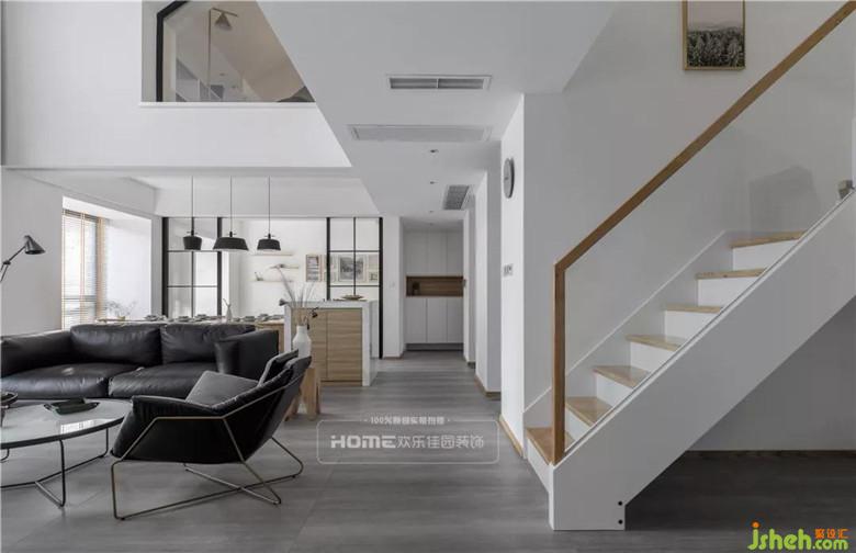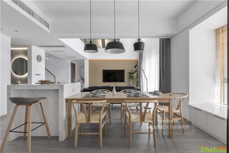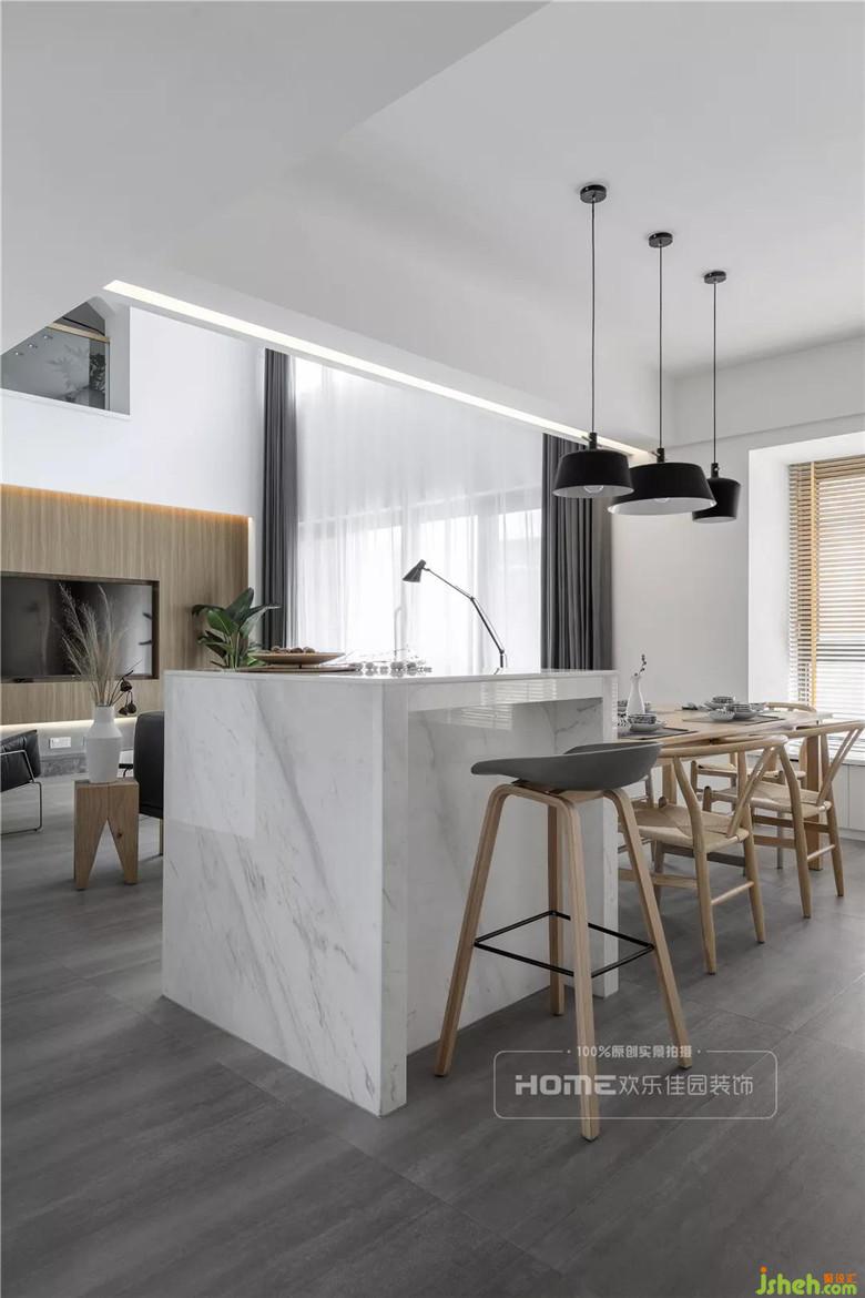 挑高戶型隔層下的空間作了餐廳和島臺的設(shè)計,與客廳相互連接和呼應(yīng),巧用家具劃分出空間功能,設(shè)計上保留了視覺的通透性,視角由餐廳島臺空間延伸至客廳,從而降低由于隔層帶來的壓迫感。