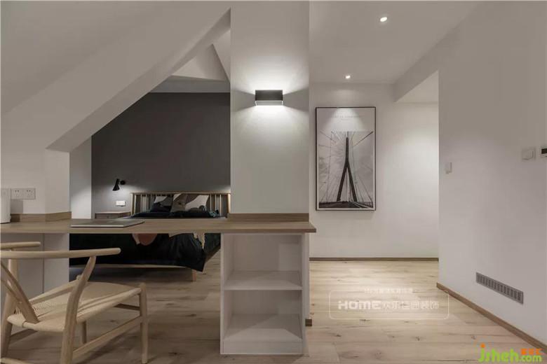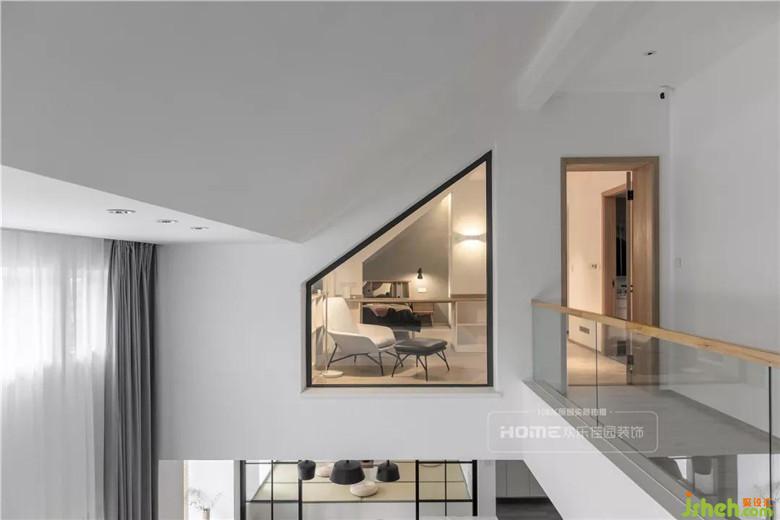 二樓空間通過設計師的重新打拆與布局,把光線引入、加入新風設備,把空間打開,形成合理的交通動線,規(guī)劃了兒童活動室和帶有書房的臥室。過廊設計了玻璃扶欄,視線毫無遮擋,讓樓上樓下的景觀融為一體。