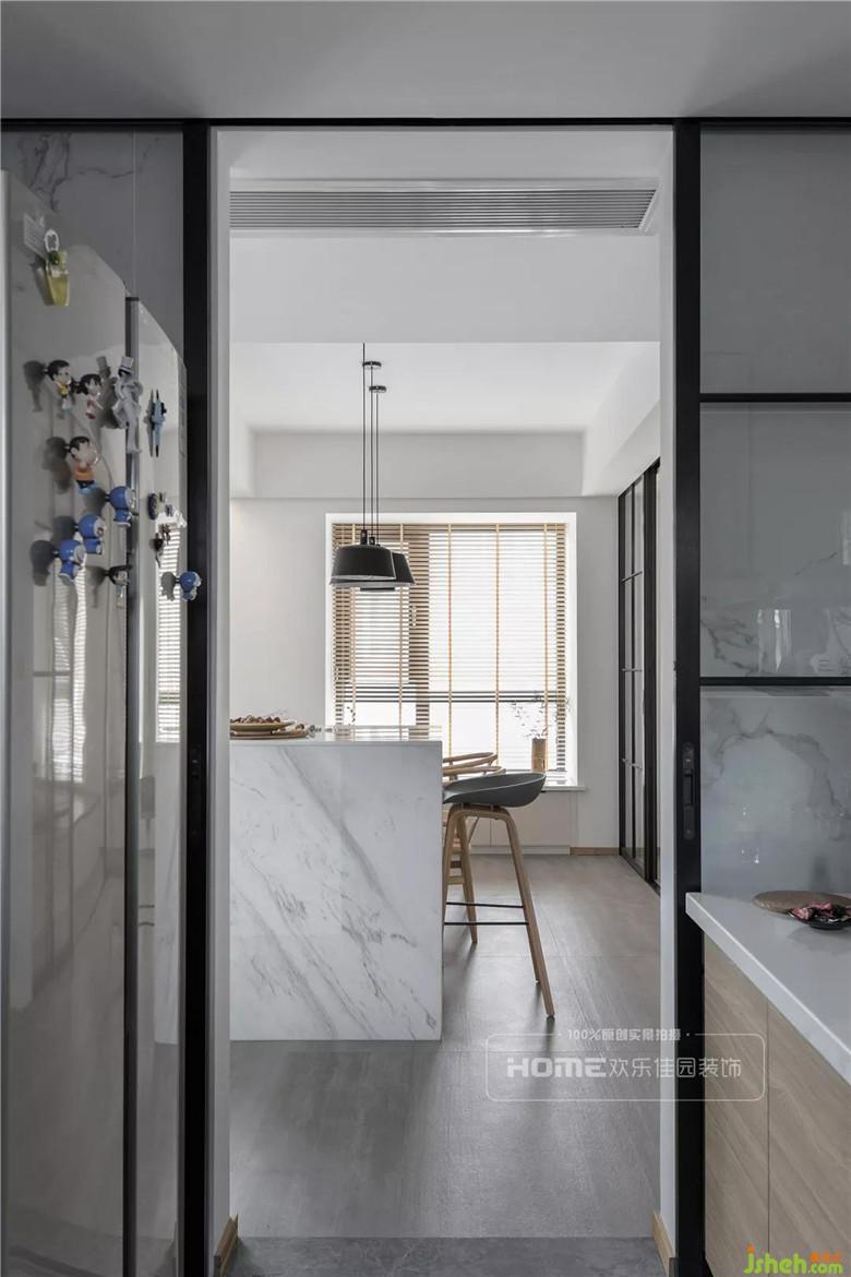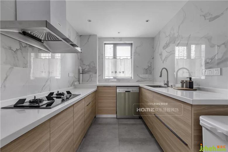 U型廚房設計,合理的動線安排,讓廚房更具人性化,操作更加便利,木質(zhì)櫥柜搭配爵士白大理石,顏色的反差,營造出現(xiàn)代時尚感,巨大收納量的柜體看起依然清爽干凈。