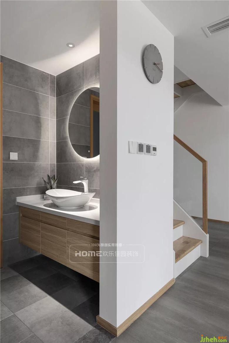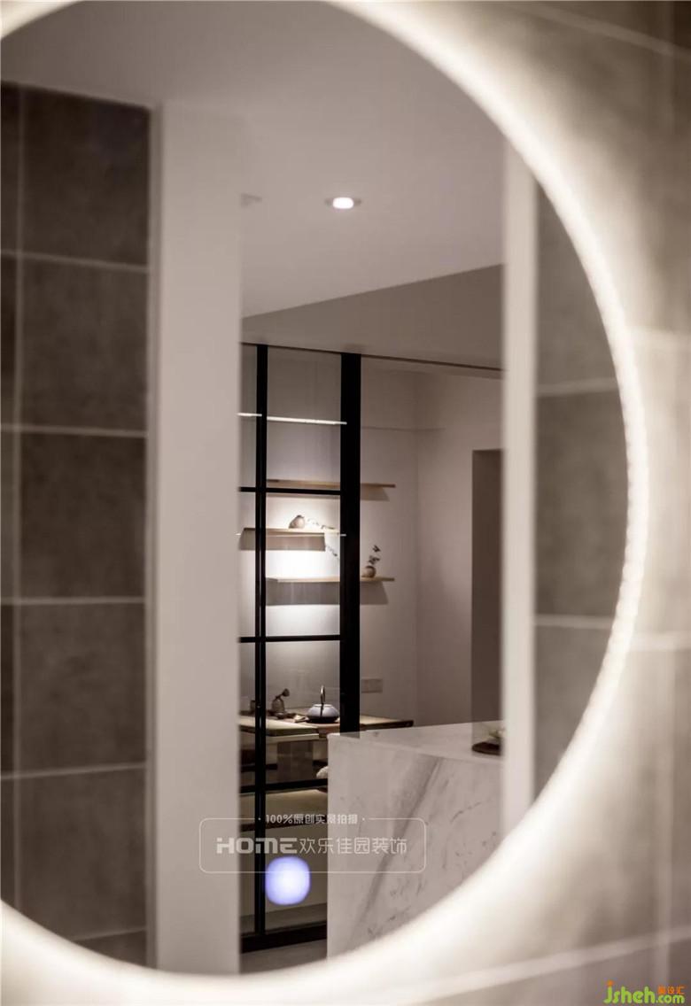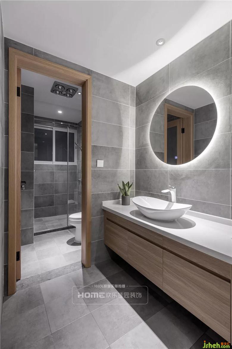 衛(wèi)生間選用灰色系仿古瓷磚,耐看耐臟兩不誤,自帶光環(huán)的圓形鏡一直都是衛(wèi)生間的主角,中性的白光與灰色地磚簡直絕配,朦朧質(zhì)感油然而生。