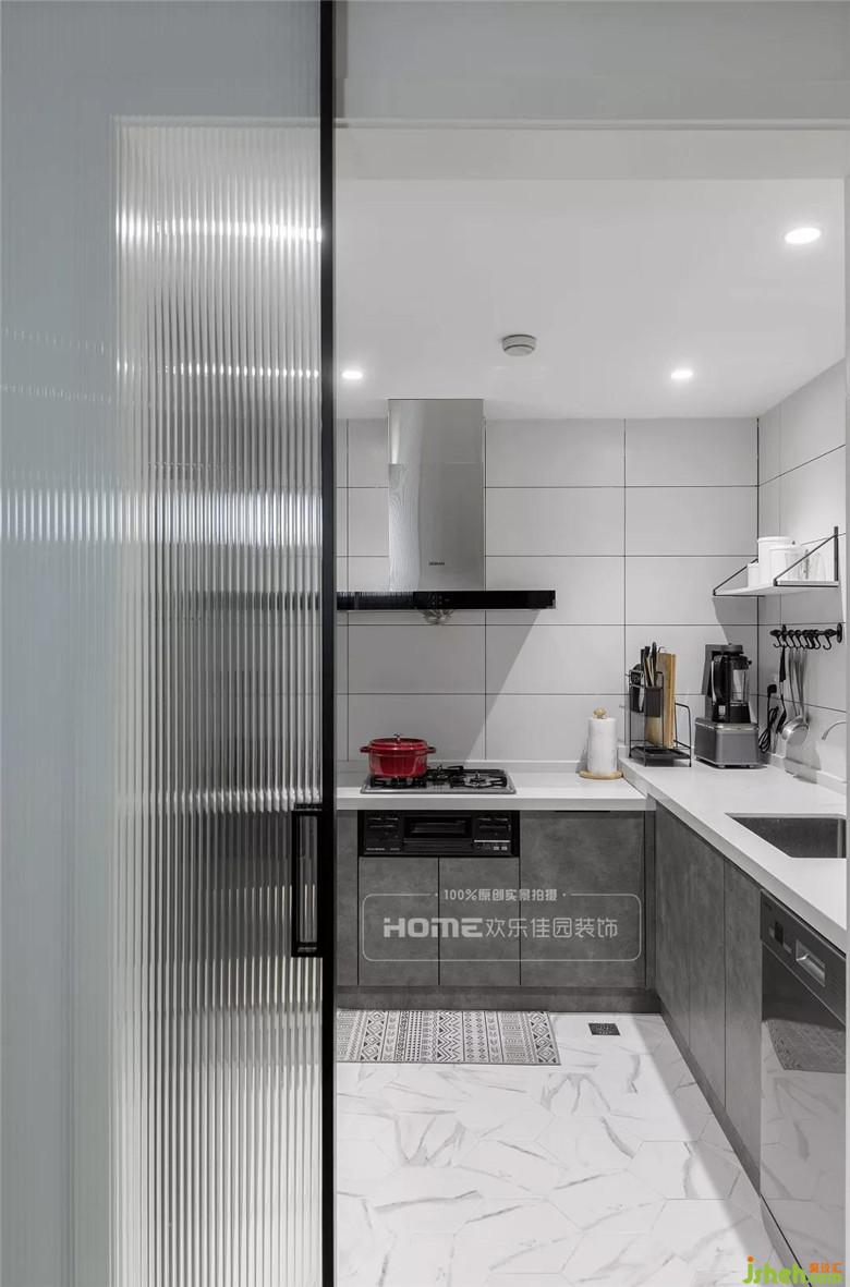 廚房整體以灰、白為主,墻面鋪設(shè)白色小方磚,與花紋地磚遙相呼應(yīng),增加透光度,水泥灰質(zhì)感的一體式櫥柜,為簡(jiǎn)約的空間注入精致的生活氣息。