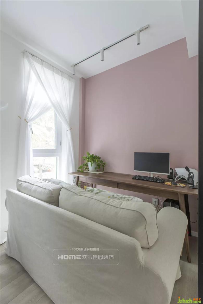 書房墻面以淡粉色為基調(diào),原木的書桌、米色的沙發(fā)相互襯托,加之綠植的點(diǎn)綴,簡(jiǎn)約清新又有活力。裝修公司