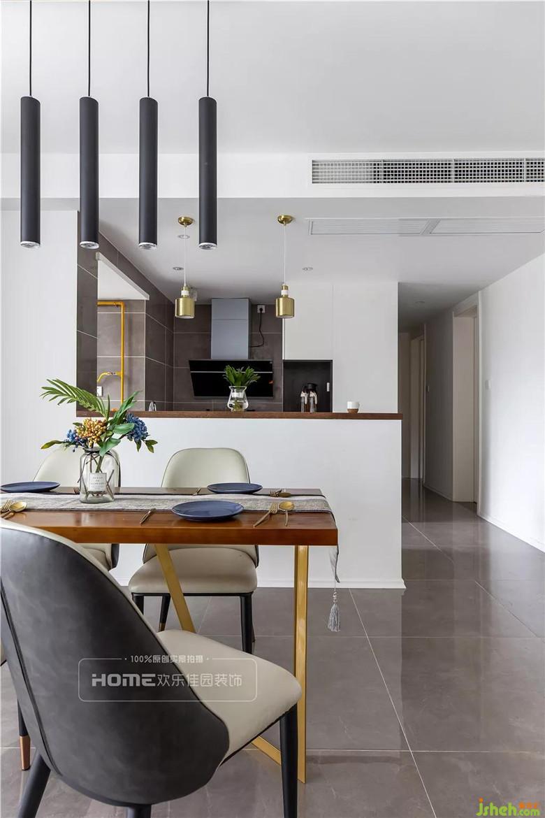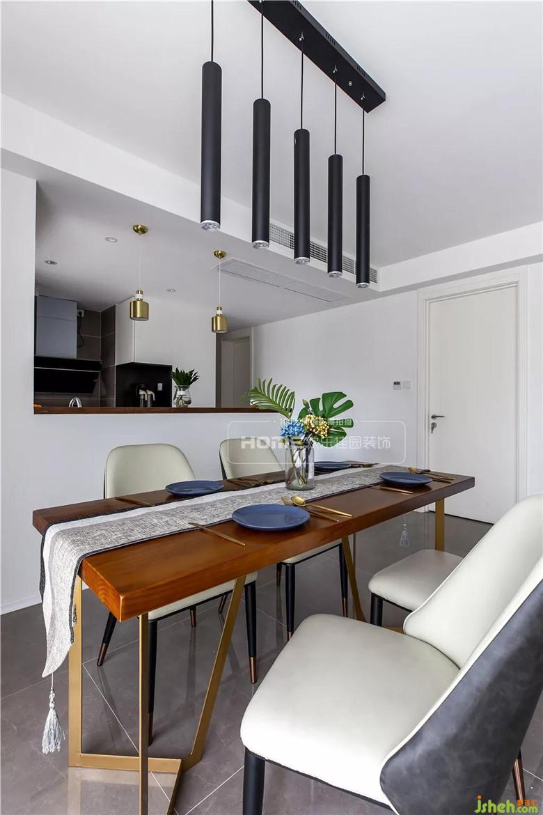 深木色的餐桌更顯沉穩(wěn),搭配灰白皮質(zhì)餐椅,舒適度與美觀度俱佳,加入少許金屬元素,硬朗的線條和材質(zhì)讓空間更具現(xiàn)代氣息,有力的營(yíng)造出一家四口、三代同堂的溫馨生活。