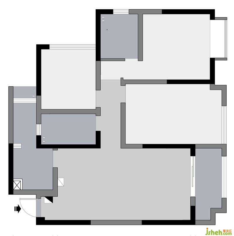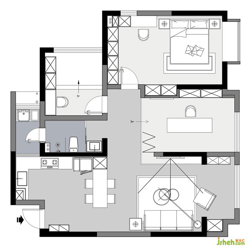 -廚房空間全部開放,與餐廳合二為一。將生活陽臺的進出改到了衛(wèi)生間。