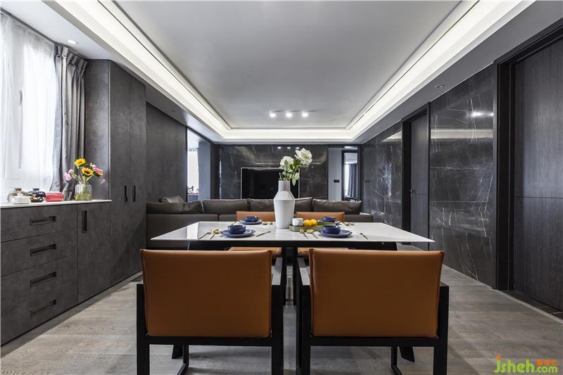 餐廳與客廳是一體的,橙色的餐椅跳脫出整個(gè)灰色格局,在靜謐的空間里也能感受生活的煙火氣。在沒有主燈的設(shè)計(jì)空間里,餐桌側(cè)面的光影灑在潔白的餐桌上,引導(dǎo)食客的視線。光線、花卉,充滿生機(jī)的自然之美充斥在室內(nèi)空間。