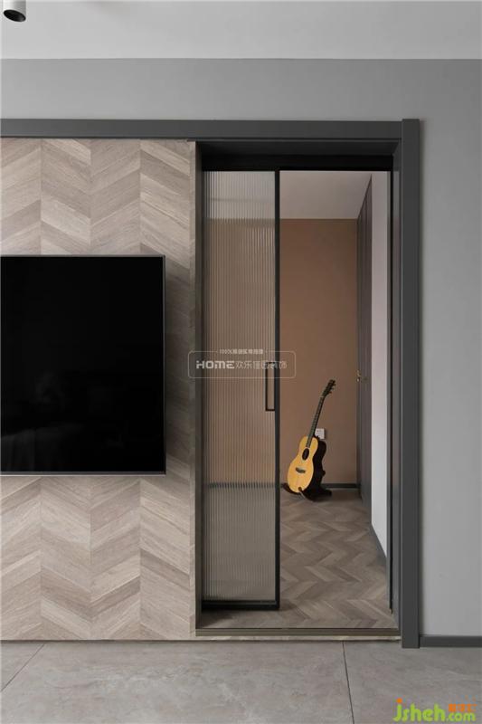 客廳與多功能活動(dòng)室空間即相連又各為兩個(gè)獨(dú)立的空間,電視墻與多功能活動(dòng)室的共用墻面采用魚(yú)骨拼地板上墻,與隱藏的長(zhǎng)虹玻璃門形成材質(zhì)碰撞。