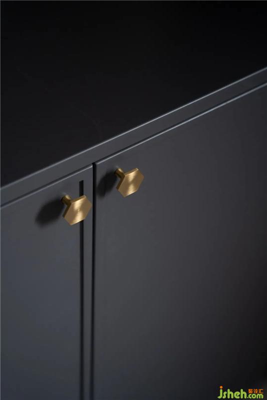 餐廳和客廳的分割帶有一個(gè)收納性極強(qiáng)的樓道空間,可以收納一些大物件,比如高腳風(fēng)扇、業(yè)主的樂(lè)器等。裝修設(shè)計(jì)儲(chǔ)物空間的櫥柜門采用的是藍(lán)灰色柜門搭配金色質(zhì)感的拉手,與空間的整體色調(diào)融合為一體。