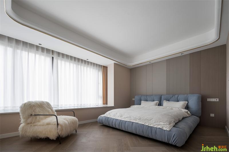 將原有衛(wèi)生間占比調(diào)小,滿足女業(yè)主獨(dú)立衣帽間的需求;用嵌入式衣柜作為獨(dú)立衣帽間的隔墻,增大空間儲(chǔ)物而又減少墻體阻隔。床頭造型利用干凈利落的線條和窗外靈動(dòng)綠植形成高反差,塑造強(qiáng)烈的視覺沖擊力,跳色的床體顏色淺淺的點(diǎn)綴頗有一種純粹而寂靜的空靈之美;身居其中緩解一天下來工作與家庭帶來的疲倦感,讓生活成為品質(zhì)的外延。