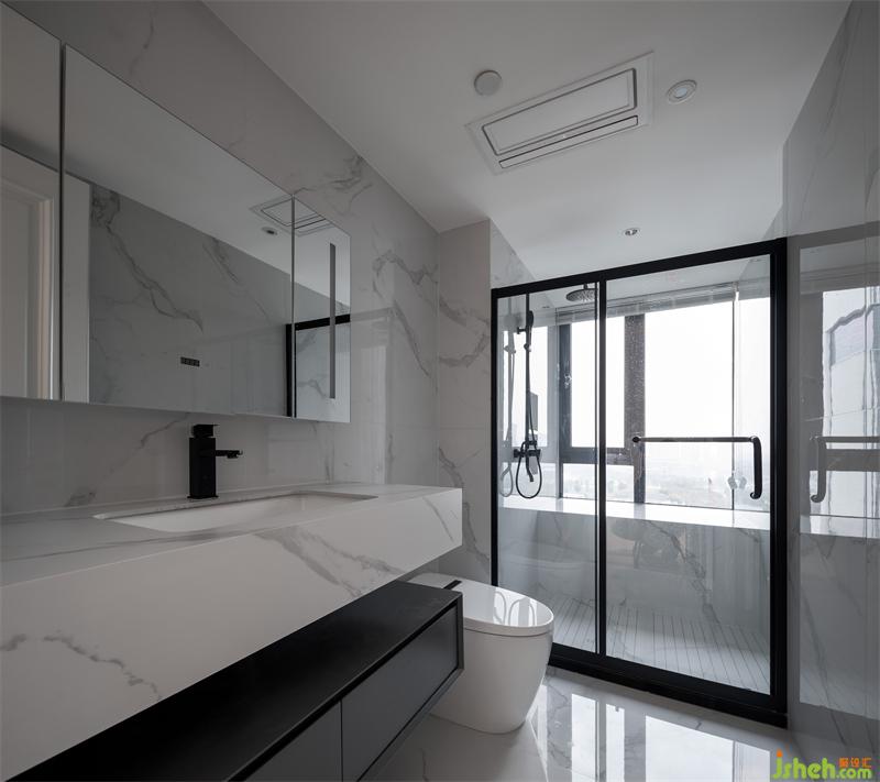 懸空雙臺(tái)盆設(shè)計(jì),儲(chǔ)物空間提升。淋浴空間用玻璃隔開,實(shí)現(xiàn)了濕區(qū)分離,黑色邊框也非常大氣,凸顯空間感。