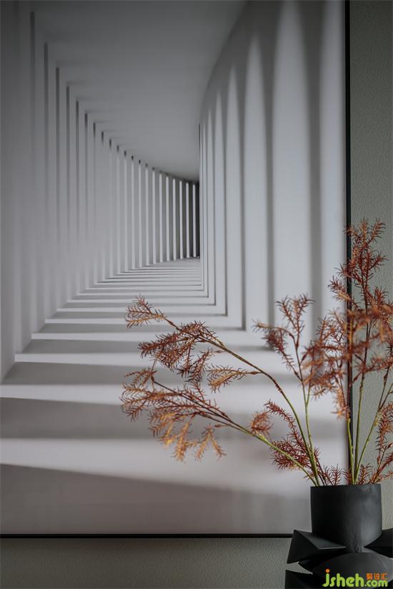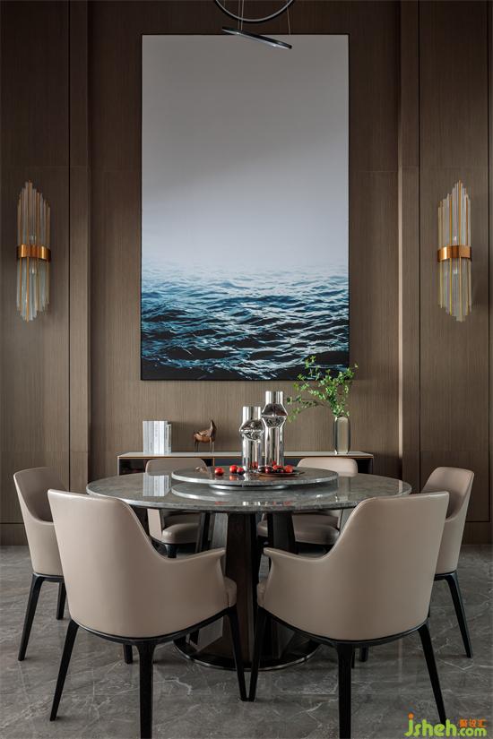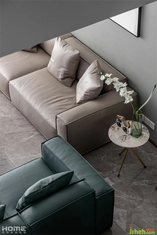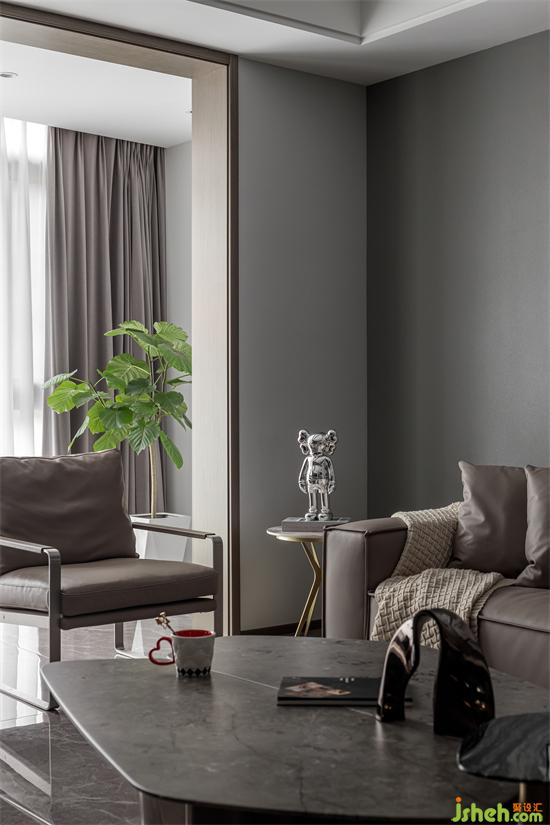 客廳采用無主燈設(shè)計,避免用吊燈會使空間感壓抑,墻面使用藝術(shù)涂料,增強空間高級感。
