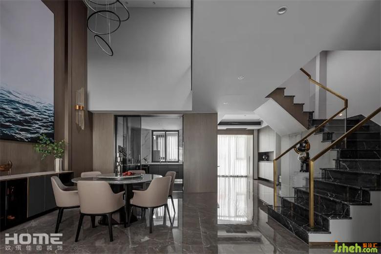 餐廳保留原有的挑高空間,增加視線感和空間感。別墅設(shè)計“空”出的餐廚廳空間呈開放式布局。與客廳形成連貫的洄游動線,讓家人有更多共處的時間。