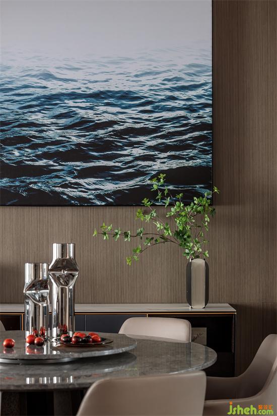將近6米的挑高空間,量身定做的巨幅裝飾畫,畫上方大量留白,與整體深色空間相呼應(yīng)。