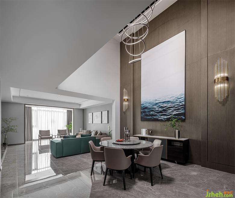 客餐廳一體化,視野更加寬敞明亮,別墅設(shè)計整個客廳的動線、視線重心都被解放。