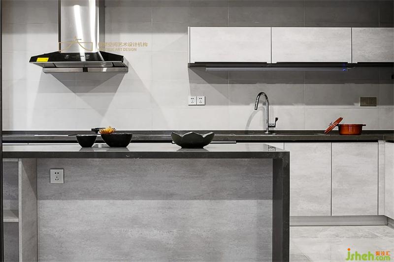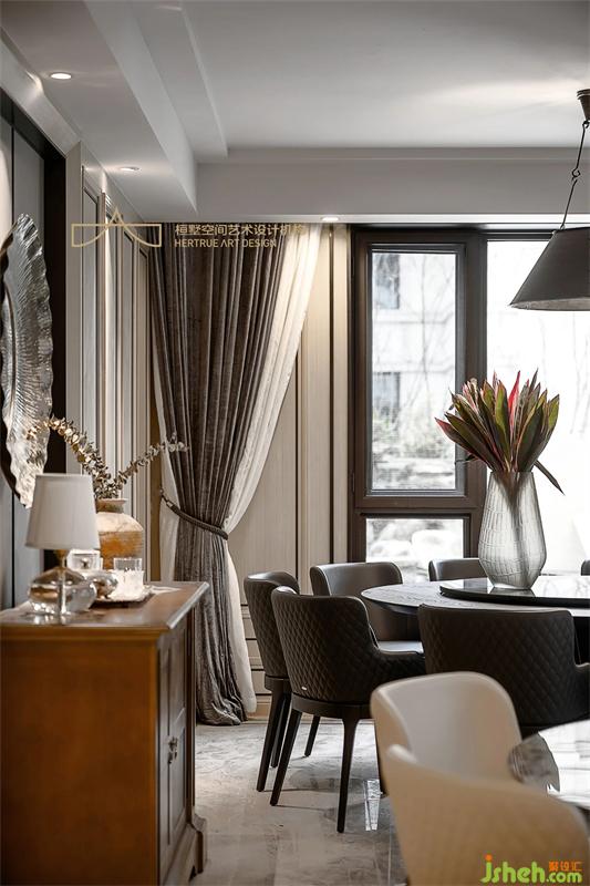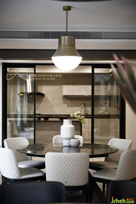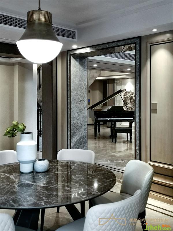 灰的不同階質(zhì)、木的不同過渡、塊面之間用細(xì)線勾勒端莊的餐廳。
