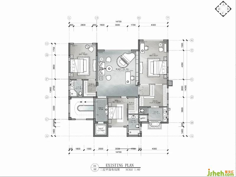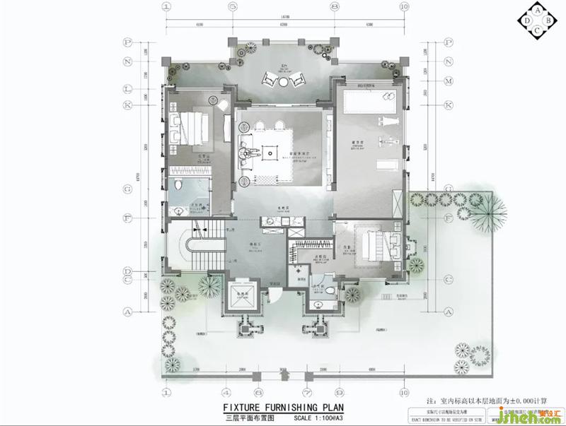 三樓為家庭起居廳、健身房、雙方父母套房,為方便老人出門(mén)散步專(zhuān)門(mén)設(shè)置了進(jìn)出花園的門(mén)。