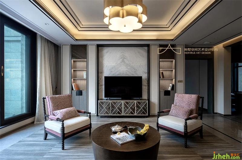 精選拼紋石材、灰暖調(diào)木面對(duì)稱(chēng)布局、一抹粉調(diào)是給莊重的一絲浪漫。