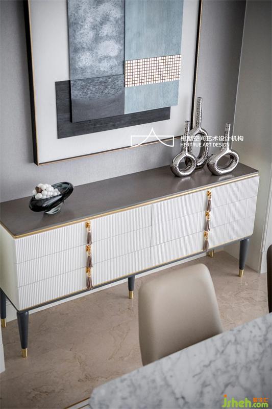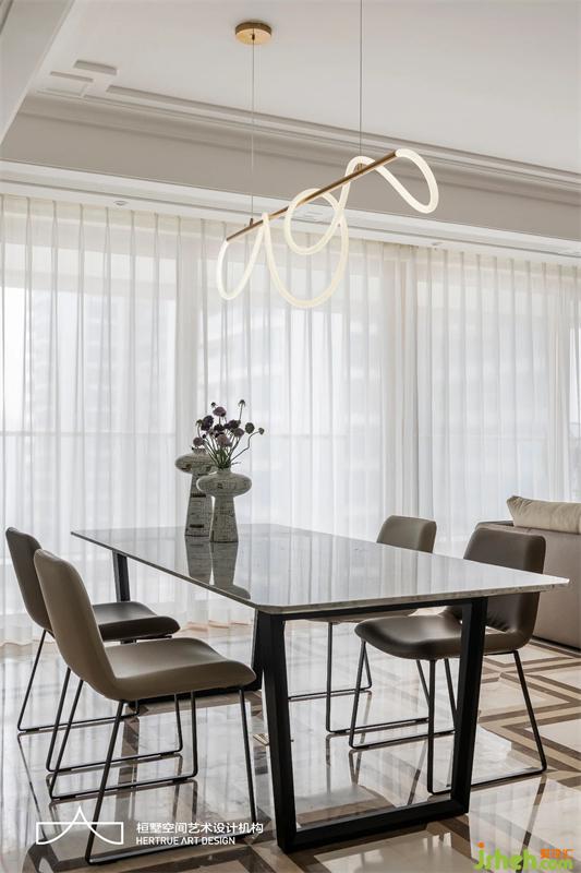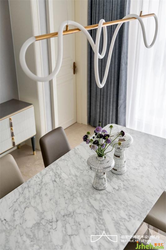 柔灰大理石餐桌勾勒出生活的質(zhì)感與品位,獨(dú)特花器里一抹綠意悄悄綻放,金屬異型吊燈的點(diǎn)綴讓靜謐的空間泛起漣漪,一日三餐,安適如常。