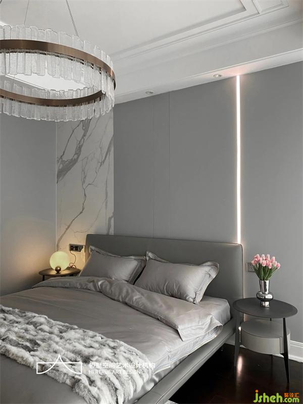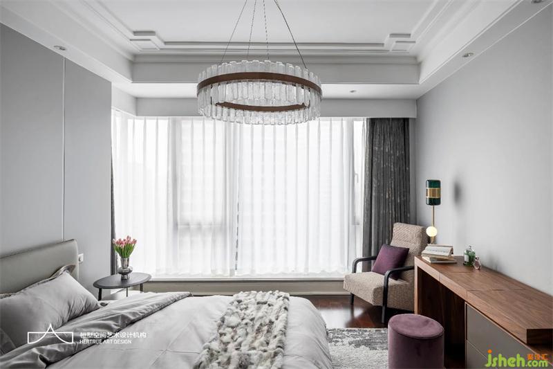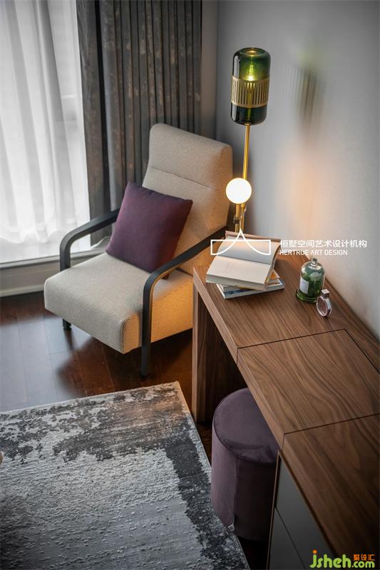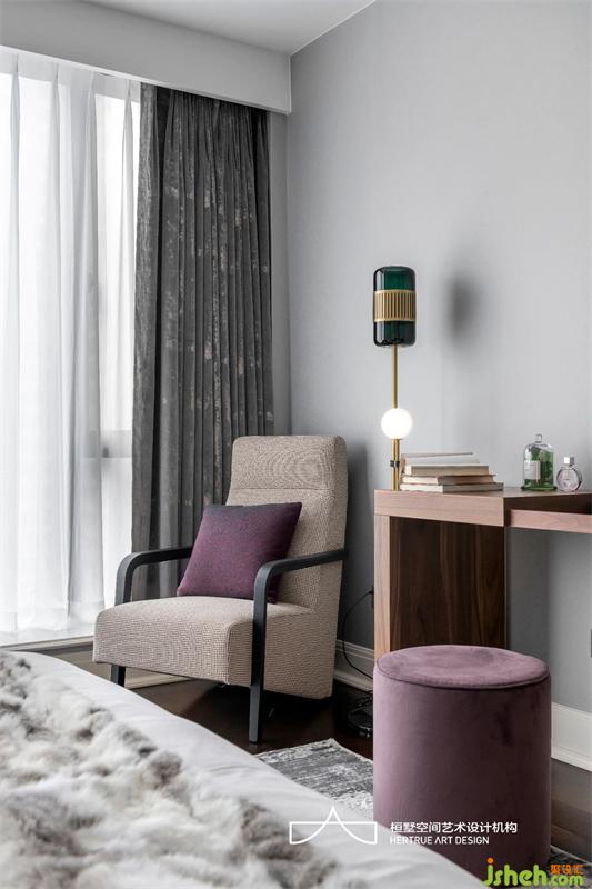 步入主臥,溫潤內(nèi)斂的陳設(shè)美學(xué)于此間彰顯?;疑{(diào)賦于空間時(shí)尚的特性,讓人感受到對色彩與肌理的獨(dú)特把握方式。紫色梳妝凳和抱枕,為此增添一抹跳躍因子,柔和優(yōu)雅的活力迸發(fā)而出。