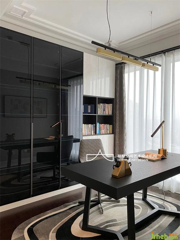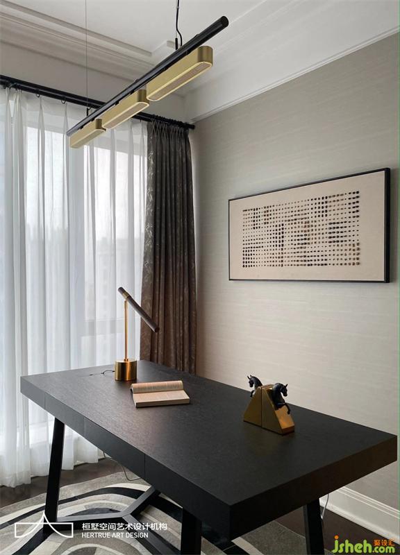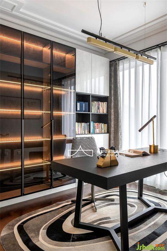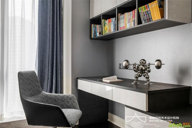 書桌以木紋肌理襯底,調(diào)和溫馨自然的書香環(huán)境。置身于書房,無論是安靜的看書、發(fā)呆亦或是小憩,都能讓繁瑣工作后的主人尋找到出口,追求心靈的寧靜。