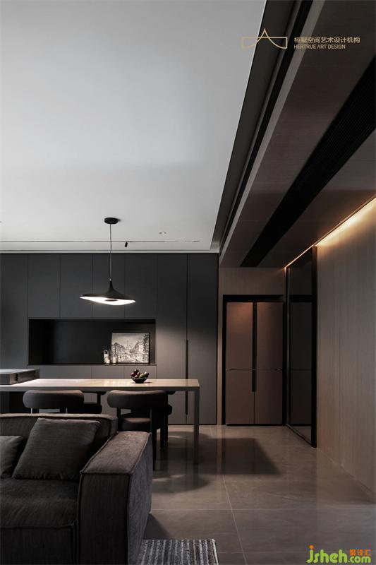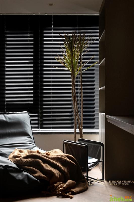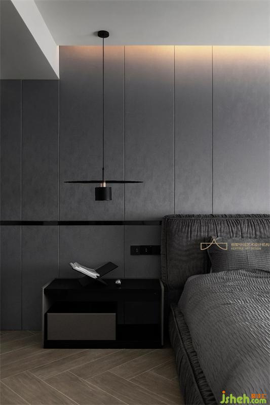 主臥空間整體也是深灰色調(diào)性,不同明度的灰調(diào)將空間拉出細膩的色彩層次,重慶裝修設(shè)計為臥室?guī)硪荒ǔ聊衩氐馁|(zhì)感。暖黃的燈光催化著情緒,寧和平穩(wěn)的心境在居室蔓延開來。