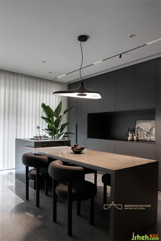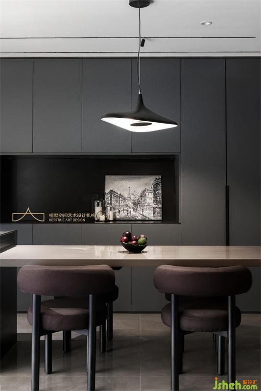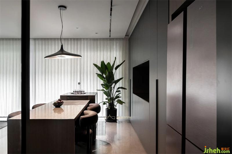 而餐廳是家中最具溫度和味覺記憶的空間,重慶裝修設(shè)計師以簡約實用的筆觸描繪這片美學(xué)場域。特意選用棕色餐桌椅平衡空間的冷冽感,另設(shè)一處中島增加空間互動與實用性,內(nèi)斂深沉的收納展示柜滿足日常需求;個性獨特的吊燈靜靜垂落,暈白的燈光溫柔而高級,緩緩照亮家人間的溫情時刻。