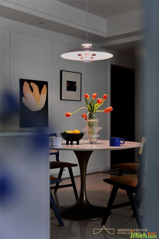 悠悠夏日,日光明媚且張揚,郁金香在花器里展露著身姿,暈染著餐廳悠哉光景。醒目的藝術(shù)畫、垂落的吊燈、靜坐的餐桌椅置于餐廳,恬然自在的生活畫面在空間里愈見清晰。