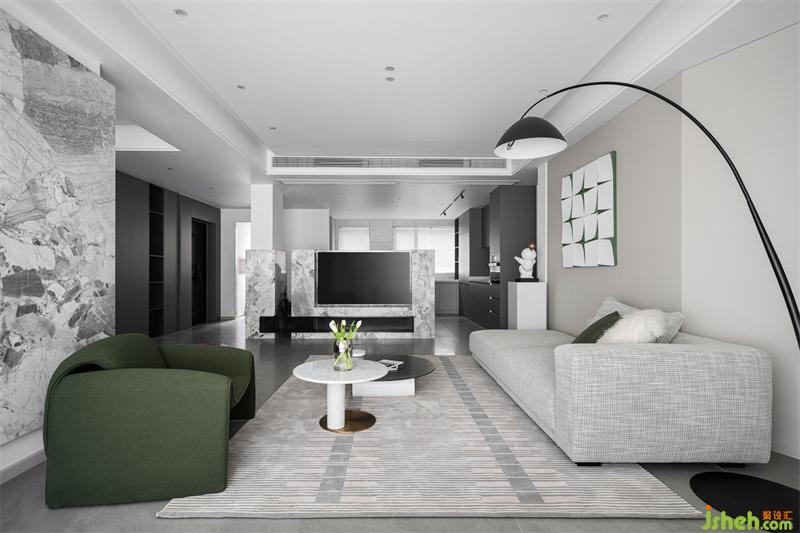 整個(gè)大客廳區(qū)域在低飽和灰調(diào)的鋪敘下,采取墨綠色作為點(diǎn)綴,安靜且酷,勾勒出簡約靈動(dòng)的空間氛圍。客廳墻面的抽象立體掛畫與幾何構(gòu)圖式地毯相互對應(yīng),搭配極具藝術(shù)格調(diào)的裝置物件、不規(guī)則的單扶三人位沙發(fā),配以休閑的地臺(tái),愜意的休閑生活方式,也兼顧生活中小憩功能的儀式感。
