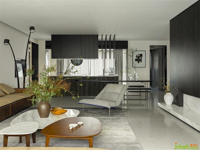 會客區(qū)完全打開面向客廳和餐廚,與之共享明媚的室外光線。
