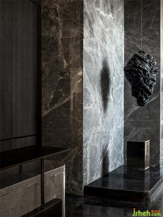 進(jìn)入售樓處空間,沉穩(wěn)的紳士灰調(diào)貫穿了整個(gè)空間。藝術(shù)中心設(shè)計(jì)簡(jiǎn)明有序的功能分布通過(guò)設(shè)計(jì)構(gòu)成方式自然過(guò)渡,又被肌理與色彩語(yǔ)言統(tǒng)一起來(lái),形成一個(gè)富于魅力的整體開(kāi)放區(qū)與后場(chǎng)塊面相對(duì),比例平衡、張力畢現(xiàn)。進(jìn)入內(nèi)部,城市與自然的意象逐一顯露,山、水、亭、宅被材料肌理解構(gòu)重塑,千年古城的歷史暗藏在厚重粗糲的天然石材深處;山水樓榭的自然意趣凝練于靜止的裝置與物象中;優(yōu)雅的東方文脈在空間的自我表述和光線的變化中逐一顯現(xiàn)??臻g與自然、歷史與當(dāng)下、人與所居之所純粹簡(jiǎn)凈地融為一體。