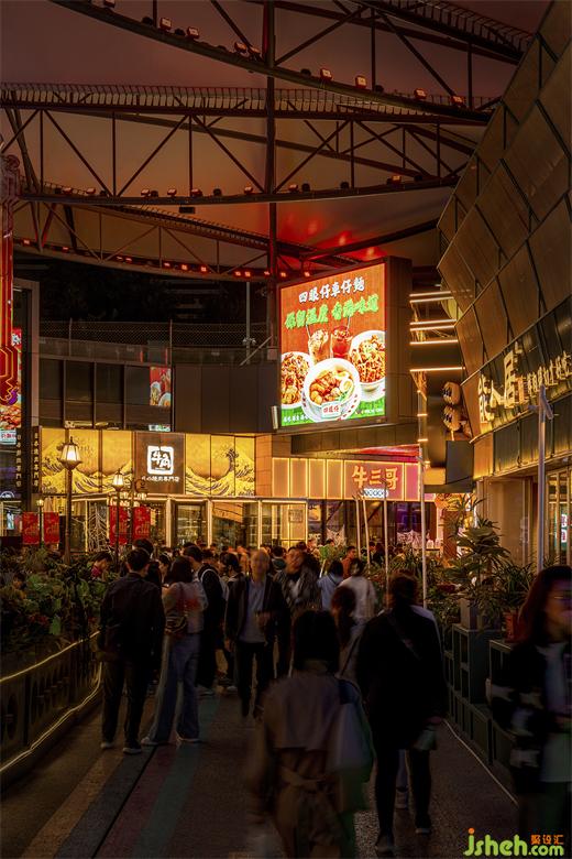 燈光設(shè)計(jì)從傳統(tǒng)中式元素到現(xiàn)代藝術(shù)表達(dá),每一個(gè)招牌都像獨(dú)立的藝術(shù)品。精心繪制的圖案和文字,在傳遞商業(yè)信息的同時(shí)也表達(dá)文化與情感。霓虹燈交織成五彩斑斕的光幕,人們或徜徉或靜坐,盡享美食美酒與氛圍場(chǎng)景的雙重盛宴。