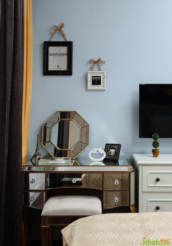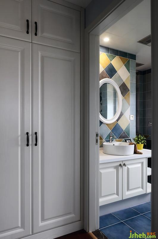衛(wèi)生間的瓷磚室內(nèi)設(shè)計師整體選用藍(lán)色系,衛(wèi)浴產(chǎn)品選用白色亮面,活躍整體空間;我們室內(nèi)設(shè)計師將一片方形瓷磚對角線切開成三角線,拼貼出腰線效果和背景圖案,即豐富了空間層次,同時也節(jié)約造價。