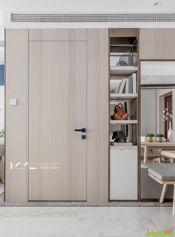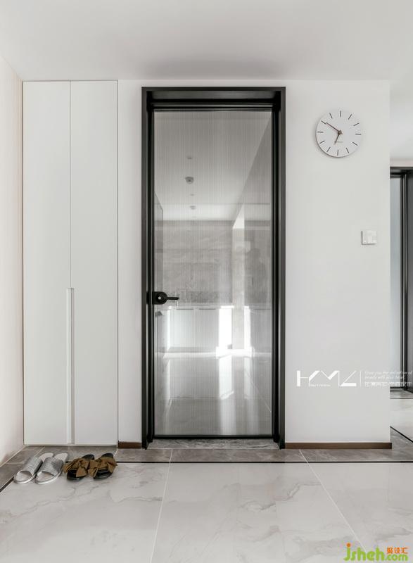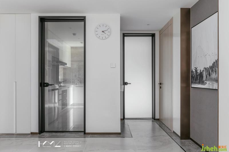 廚衛(wèi)門我們室內(nèi)設(shè)計(jì)師選用黑色細(xì)框造型,追求現(xiàn)代新中的精致、時(shí)尚。廚房門的玻璃是用來(lái)了豎條夾絹玻璃,在餐廳隱約能看到廚房的空間,衛(wèi)生間門使用透光的乳化玻璃,在做到隱私的同時(shí),也保證了衛(wèi)生間的光線最大化,兩樘門都做到了盡可能高,使空間層次更加硬朗。