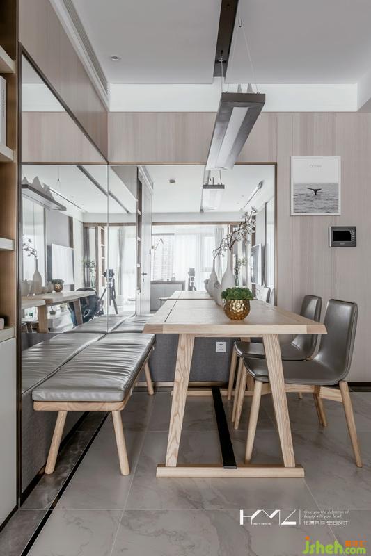 銀鏡墻面,拓展了空間層次,大面的使用也稍許顯得生硬,為此,我們將剩余部分墻面滿貼KD板木飾面,用木質(zhì)稍柔和的質(zhì)感,與鏡面互相交融,使得畫面更加和諧。木飾面的選擇上,我們使用淺色系的原木紋理,更加貼合自然,凸顯新中氣質(zhì)。銀鏡下墻裙,我們室內(nèi)設(shè)計(jì)師用布藝硬包呈現(xiàn),與其他材質(zhì)相比,使空間氣質(zhì)更加柔和,也起到了仿椅腿碰撞,保護(hù)墻面的使用年數(shù)。