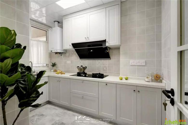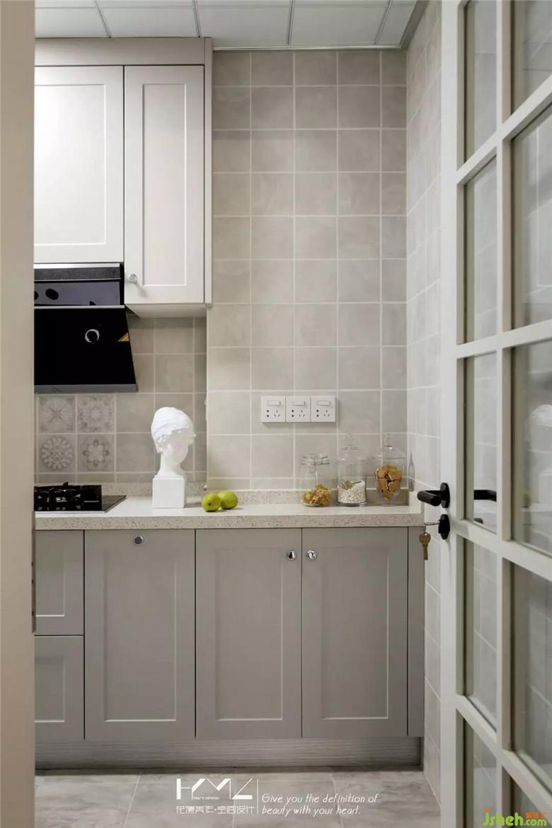 廚房裝修公司保留了較大的操作空間,格子花磚與淺灰色柜體融為一體,銀色的小圓把手讓整體多了一份精致的味道,這樣的廚房不顯擁擠,適合夫妻倆齊齊下廚。