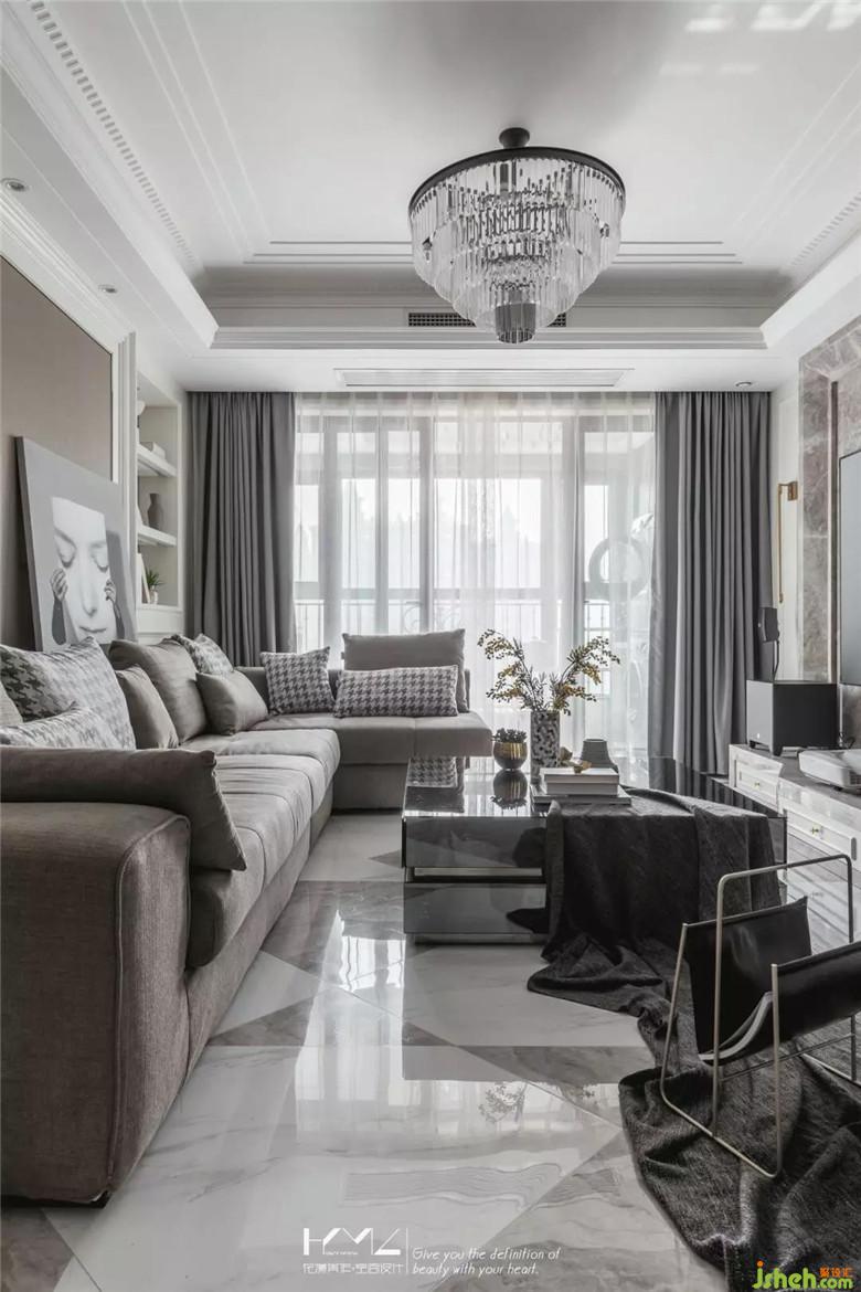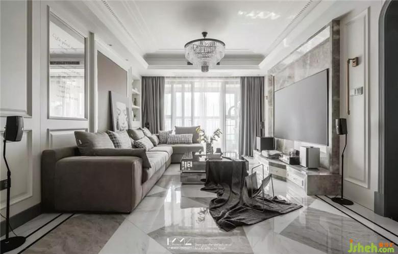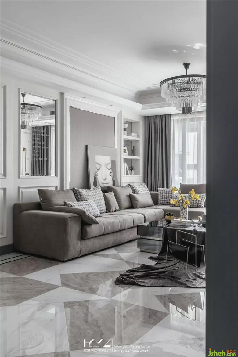 客廳地面地磚,選用了兩種顏色紋理進行拼接鋪設,設計了鉆石切割的鋪貼方案,高貴的材質感,體現摩登時尚的生活品質,即使家居生活中不鋪地毯,也是讓人賞心悅目的。