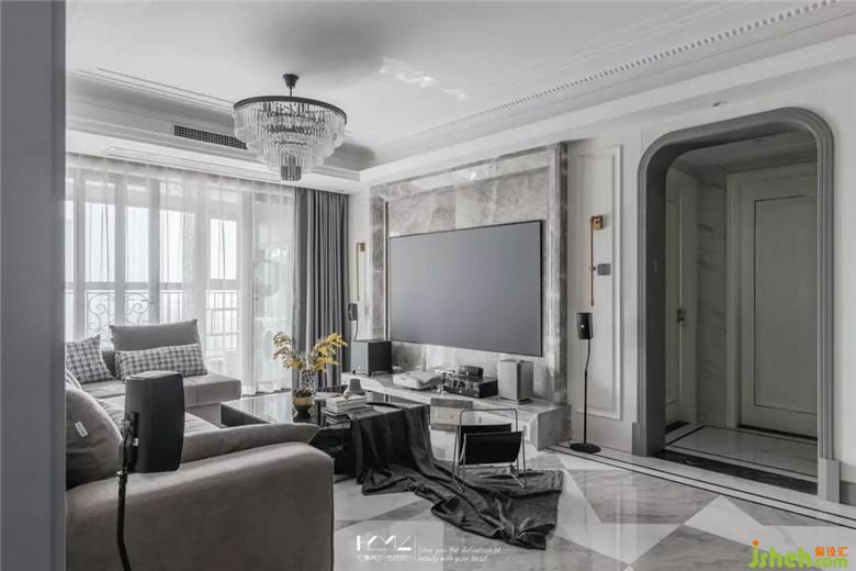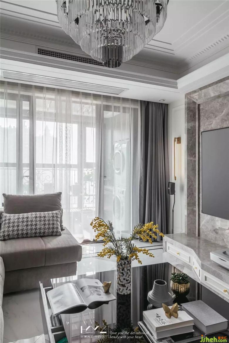 業(yè)主很喜歡新奇的電子產品,所以我們的電視機被100寸的硬屏投影屏幕所取代,電視背景墻采用簡約的大理石剖切造型,將屏幕鑲嵌其中,兩側白色簡歐護墻板圍合,金屬長桿壁燈點綴,精致大雅。