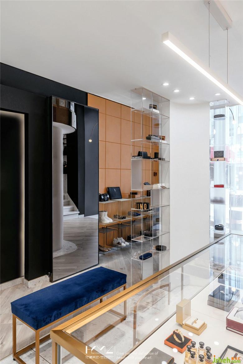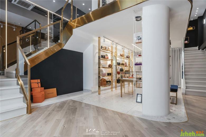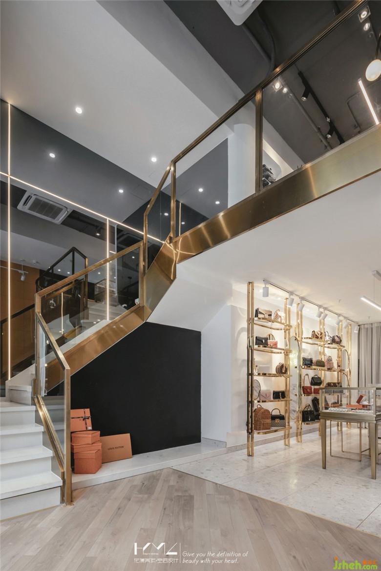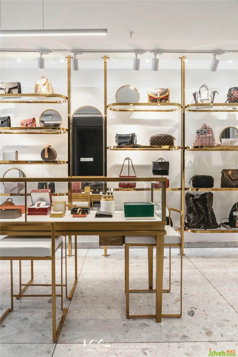 一樓的產(chǎn)品展架,裝修公司使用金色不銹鋼定制框架,結(jié)合玻璃層板,兩種硬度高的材質(zhì),用以襯托皮質(zhì)產(chǎn)品的特質(zhì)。
