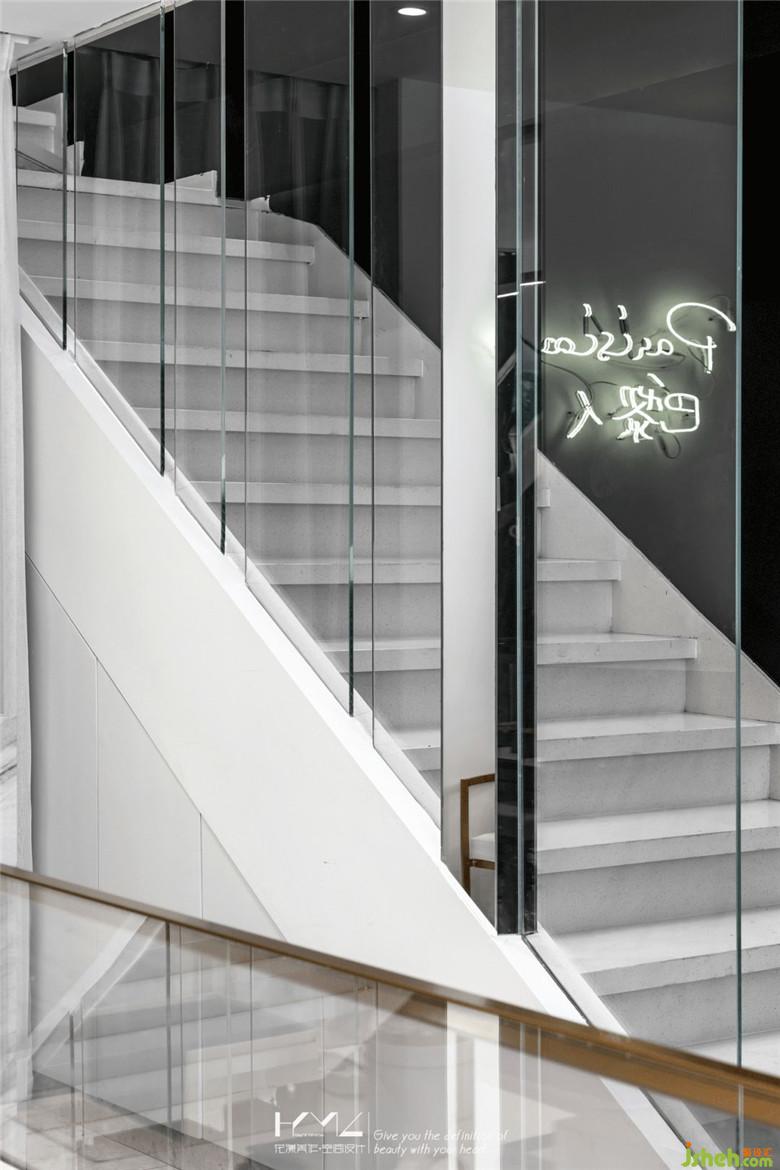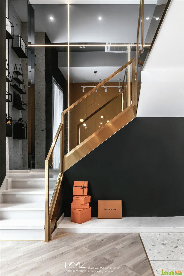 樓梯及二層欄桿,裝修公司同樣使用玻璃,這樣能夠保證空間的通透,扶手包裹香檳金色拉絲不銹鋼,著重體現(xiàn)展示空間的現(xiàn)代感與精致度。