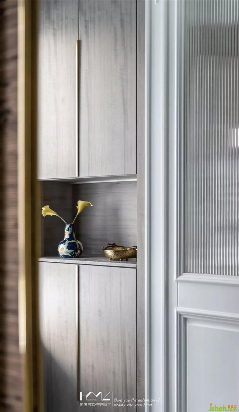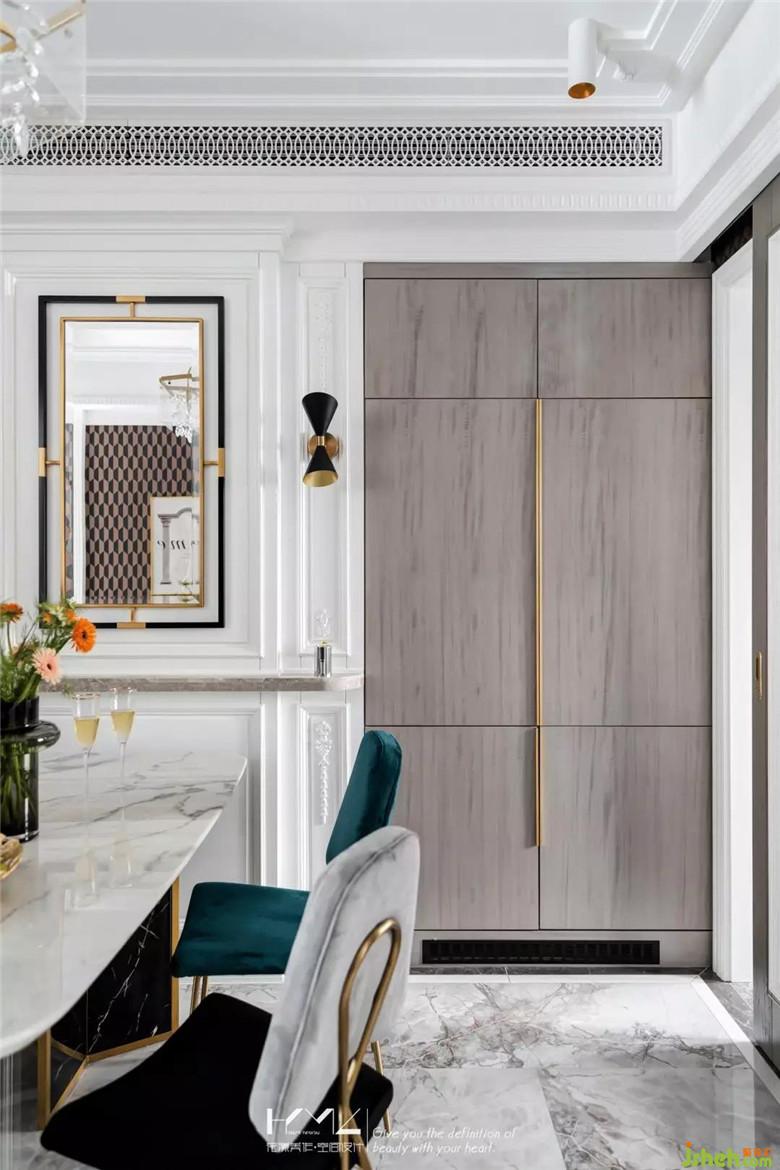 功能上,腰線處弧形大理石條板挑出,可放置裝飾品或者餐廳常用物品;冰箱亦放置在了餐廳,且作了隱形處理,與墻面護墻完美融合,與入戶鞋柜柜門,使用了同樣的影木材質,搭配香檳金色長把手,簡約精致。廚房定制了吊軌移門,大塊面的長虹玻璃嵌入,保證了餐廳的采光充足。