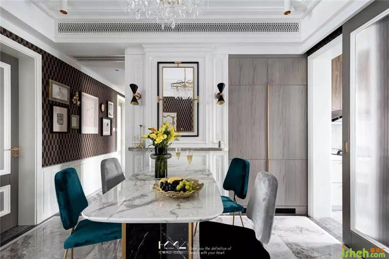 配色上,餐椅的配色與客廳沙發(fā)配色呼應,湖水綠/黑灰的絲絨與金色細腿結合,餐桌則是黑白大理石的組合,壁紙則是英國cole&son的幾何系列,型號是112/5022,這種明顯的上下色塊區(qū)分,明暗有序,創(chuàng)造出一種低調復古的優(yōu)雅感,同時豐富空間層次細節(jié),護墻的分割比例細節(jié)組合提高了空間尊貴的調性。裝修公司