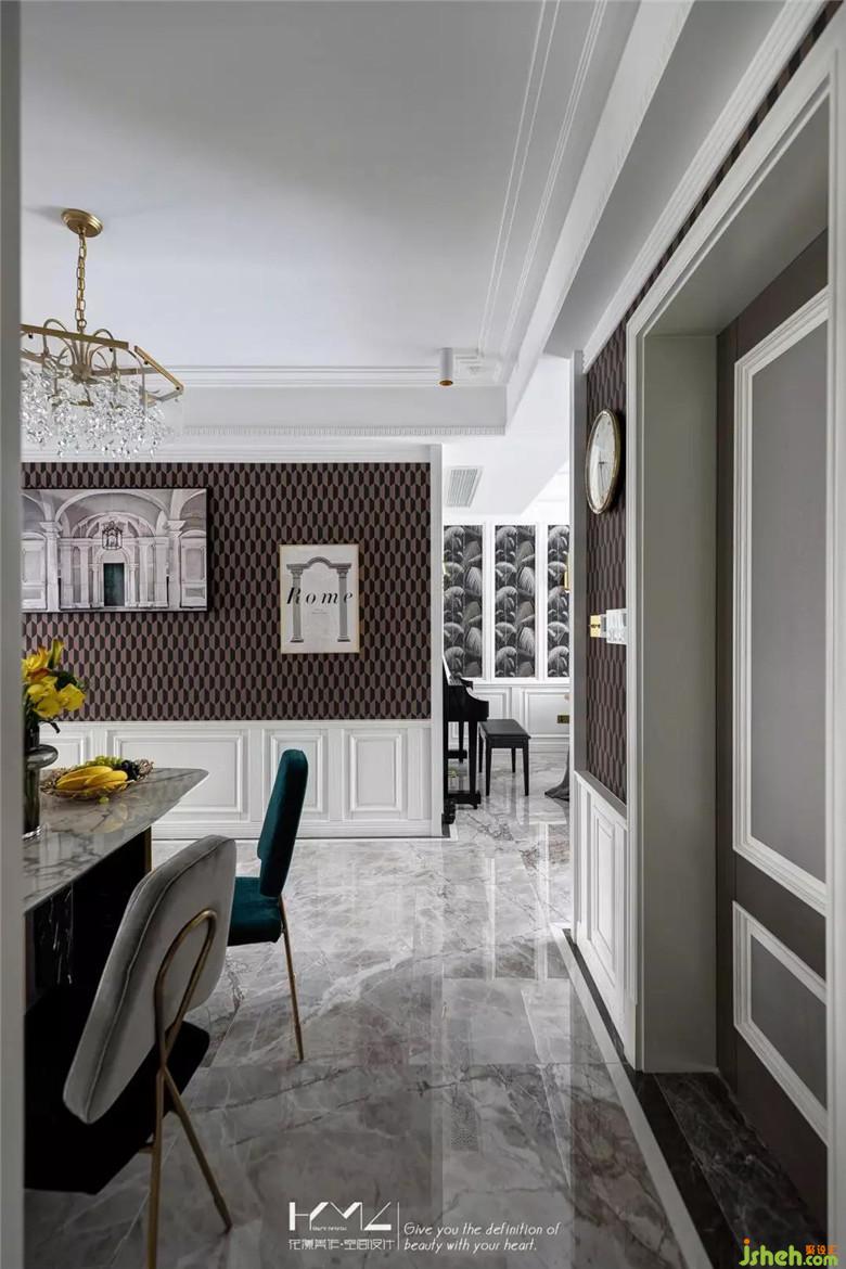 右手邊的飄窗臺面,定制軟墊,當換鞋凳使用;正對的白色護墻面與長虹玻璃結合,隱約可以看到廚房;入戶門右側,金邊全身鏡和精致的傘架組合,隨時整理儀表體態(tài),大幅鏡面,也同時拓展了入戶小空間的視覺,復古造型的頂燈,增添門廳濃郁的儀式感和莊重感。裝修公司